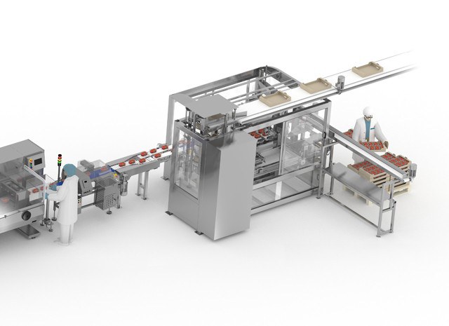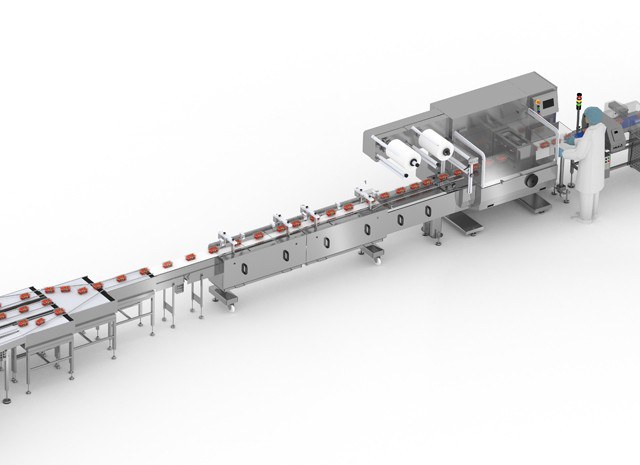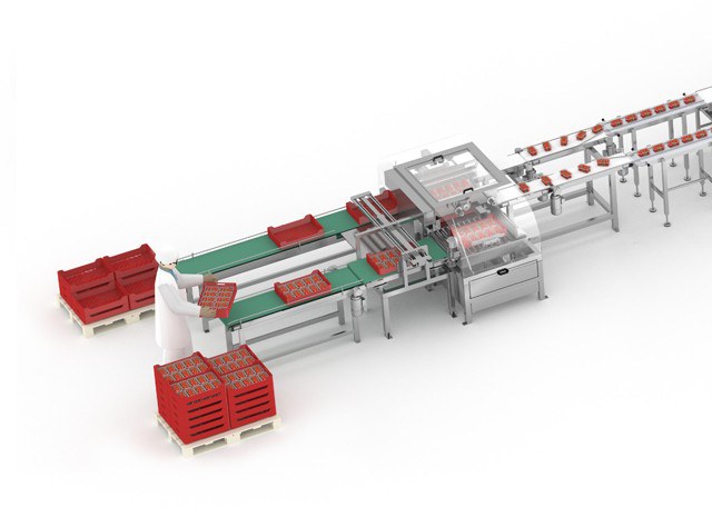 De flowpacker verzorgt de primaire verpakking van elke tray aardbeien. Hiervoor wordt een automatische feeder gebruikt voor het positioneren en het verkrijgen van de exacte scheiding tussen trays zodat de doorstroming van het proces optimaal is.