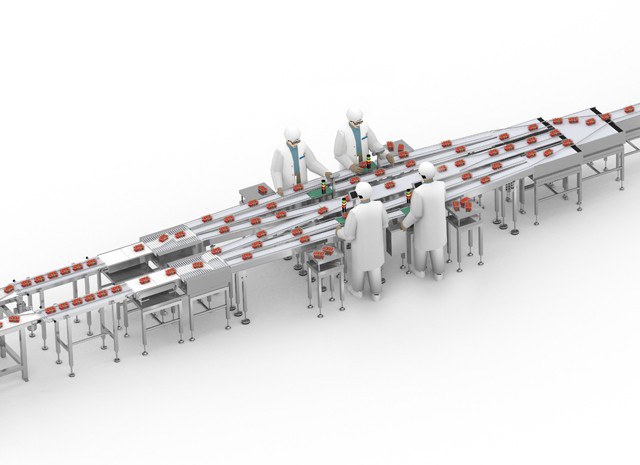 De operator is verantwoordelijk voor het verkleinen en / of vergroten van de inhoud van elke tray, zodat alle trays die het weegcontrolegebied verlaten met het gewicht zijn aangepast aan het vastgestelde bereik.