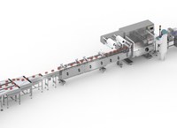 Complete lijn voor het verpakken van trays met aardbeien in een flowpacker.