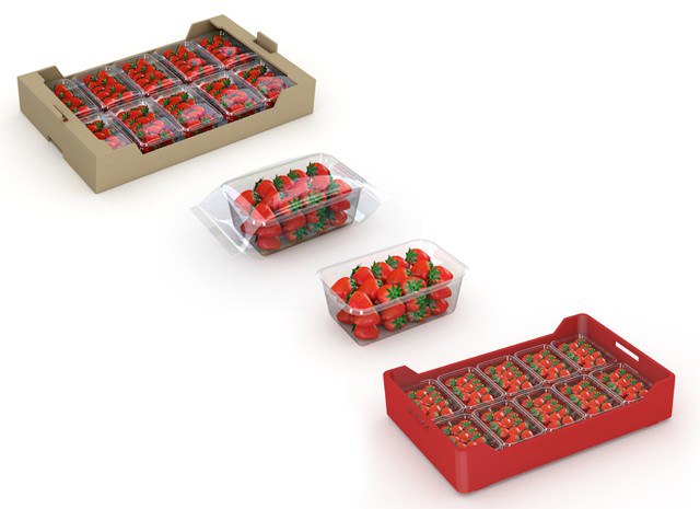 De aardbeien komen aan in plastic trays in een plastic krat. Waar ze uitgepakt worden om elke tray te kunnen wegen en te kunnen verpakken.