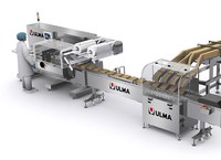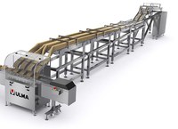 Het aanvoersysteem heeft vier rijen product dat op de rand aankomt en door middel van vibrerende kanalen wordt geroteerd en op de aanvoerband van de wikkelmachine wordt afgezet.