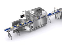Een 90 ° transfersysteem koppelt de pakketten in de bufferband van de vacuümkamer zodat beide sealbalken kunnen worden gebruikt. Als de producten niet klein genoeg zijn om te worden gekoppeld, laadt een automatisch detectiesysteem het product als een enkel item.