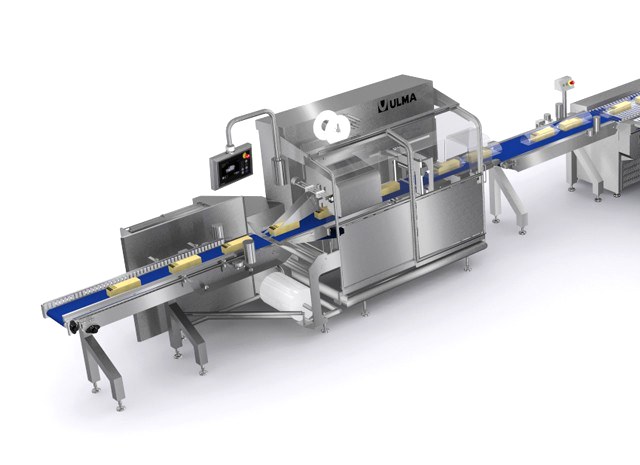 Het dubbele automatische transfersysteem gepatenteerd door ULMA Packaging maakt het mogelijk om uit de verpakkingsmachine zakken te halen die afwisselend aan de voorkant en aan de achterkant open zijn, zodat het mogelijk is om het laden van de pakketten naar een vacuümkamerband met dubbele sealbalk te automatiseren, gebruikmakend van een 90º transfersysteem.