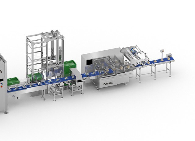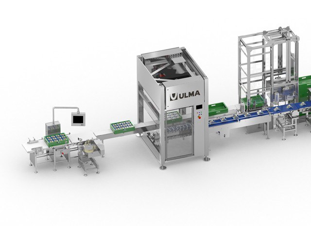De lijn heeft een automatische ontstapelaar voor lege plastic kratten die de gerobotiseerde casepacker cel vult.