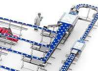 De uitlijner wordt net na de thermoformer geplaatst en verandert de drie rijen in één enkele, zodat ze later kunnen worden geïnspecteerd door de metaaldetector die net voor de dozenverpakker is opgesteld.