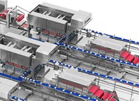 Door middel van een speciaal aangepast transportsysteem voor vers product dat de reinigingstaken vergemakkelijkt, wordt de productstroom verdeeld in twee gebieden die het product op een evenwichtige manier naar de dieptrekkers verdelen.