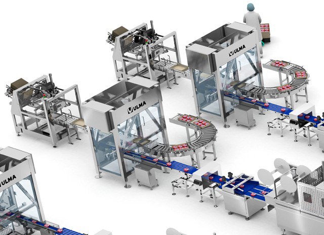 Elk van de drie lijnen heeft een doosopzetter die de kartonnen dozen vormt met de gestapelde kartonnen vellen. De gerobotiseerde doosverpakkingscel is verantwoordelijk voor het introduceren van de thermogevormde pakketten in de dozen en rangschikt ze volgens het vereiste mozaïek voor de pakketten.