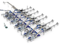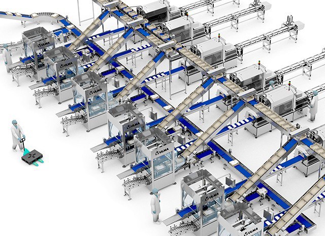 Elk van de zeven lijnen is uitgerust met gerobotiseerde casepackercellen die in staat zijn om trays in te delen zoals dat nodig is voor de doos. Ze worden geleverd met de lege dozen die via het systeem van transport en distributie binnenkomen.