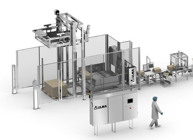 Voorafgaand aan het palletiseren plakt een inline geïntegreerde etiketteermachine een etiket op elke doos.