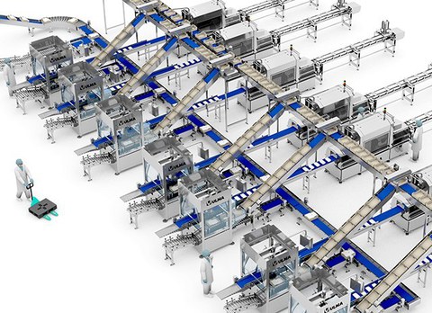 Volledig geautomatiseerde oplossingen voor de vleesindustrie, van de handling en het laden van het product tot de uiteindelijke kratverpakking en palletisering.