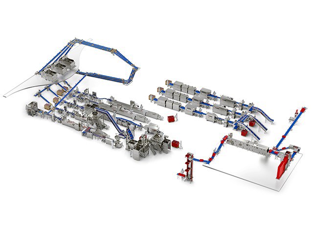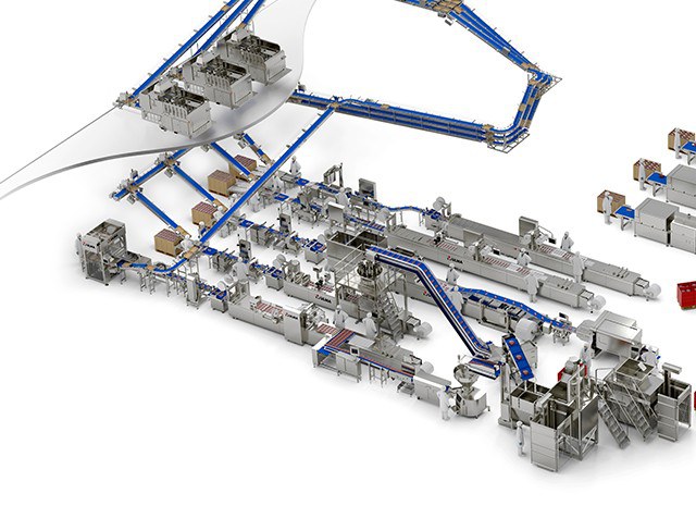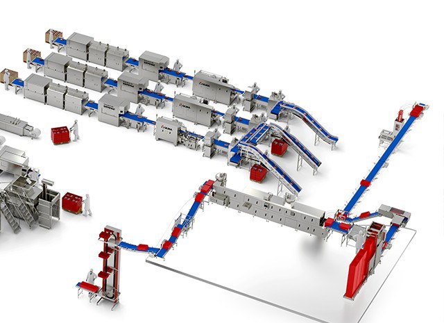 De lijnen worden aangevuld met geïntegreerde voorbereidingsapparatuur, snijmachines en zelfs automatische laadapparatuur, evenals automatische weeg- en etiketteerapparatuur en metaaldetectoren.