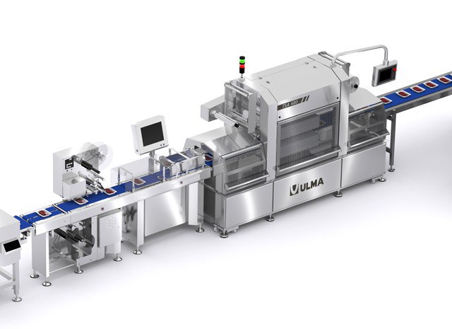 De TSA hygiënisch design traysealer van ULMA sluit de trays van vleesfilets af in een gecontroleerde atmosfeer (MAP) om hun houdbaarheid te verlengen. Het heeft een automatische trayontnester die de trays naar de invoerband voert.
