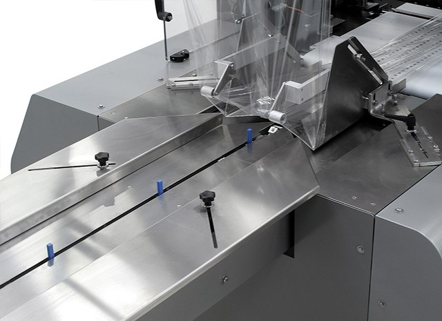 - De toevoerband heeft duwers die het product dragen en hun positie wordt automatisch gesynchroniseerd met de dwarslaskop.