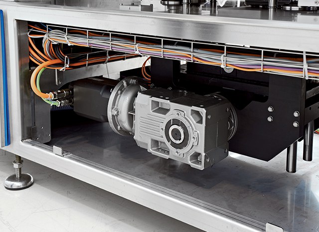 - Aangedreven drummotor voor traytoevoer- en positioneringsband.