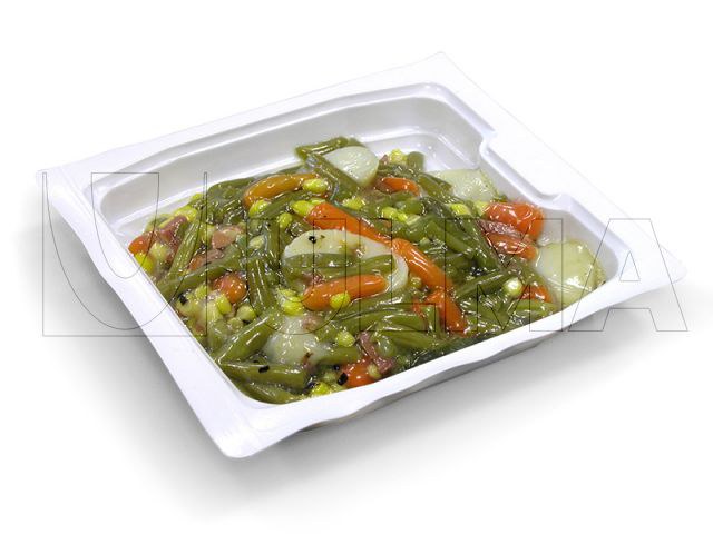 Kant-en-klaar maaltijd skinverpakt met thermoformer 1971_1.jpg TFS SKIN hygiënisch ontworpen thermoforming machine voor het produceren van vacuum-skin verpakkingen, die het product beschermen. Skin betekent dat de bovenfolie als een '2e huid' om het product gesloten wordt doormiddel van vacuüm.